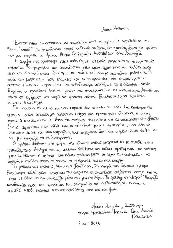 Έχοντας πλέον την απόσταση που απαιτείται ώστε να κρίνω με νηφαλιότητα τον διετή «πυρετό» των Πανελληνίων –χωρίς να ξεχνώ τις δυσκολίες- αναλογίζομαι τα εφόδια που μου παρείχε το Πρότυπο Κέντρο Φιλολογικών Μαθημάτων Ρένα Κουτροζή.