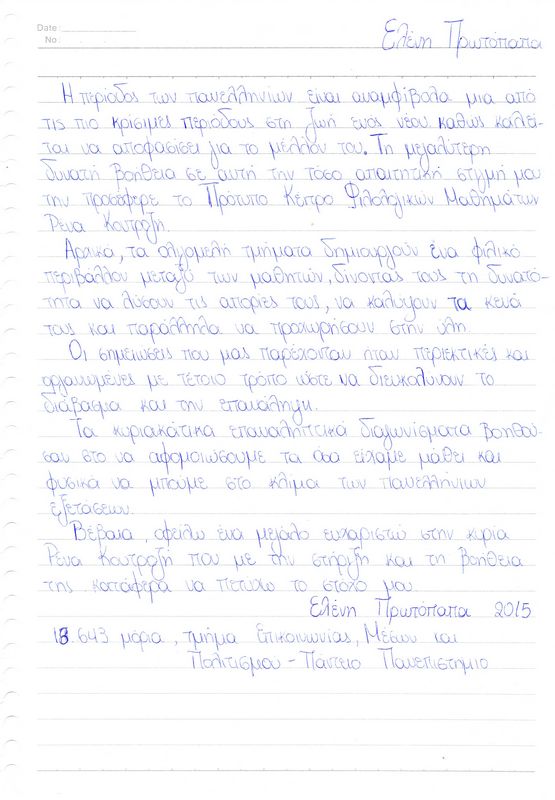 Η περίοδος των πανελληνίων είναι αναμφίβολα μια από τις πιο κρίσιμες περιόδους στη ζωή ενός νέου, καθώς καλείται να αποφασίσει για το μέλλον του. Τη μεγαλύτερη δυνατή βοήθεια σε αυτή την τόσο απαιτητική στιγμή μου την προσέφερε το Πρότυπο Κέντρο Φιλολογικών Μαθημάτων Ρένα Κουτροζή.